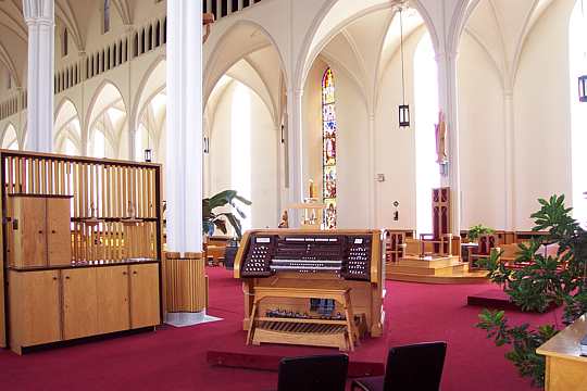 L'orgue est un Casavant datant de 1921, acquis à l'époque au coût fabuleux de 25,000 $. Il fut restauré en 1979 par la maison Guilbault Thérien de St-Hyacinthe pour commémorer le 150e anniversaire de l'érection canonique de la paroisse. Cet orgue à traction électro-pneumatique comporte 63 jeux, quatre claviers et un pédalier. La console est mobile. Derrière la façade de l'orgue logent 4500 tuyaux. Les trompettes à l'horizontale, dites en chamade, sont d'inspiration espagnole. Le grand orgue, d'esthétique française, est un des instruments dits "romantiques" les plus appréciés des organistes du Québec et de l'étranger. Il correspond parfaitement à l'exécution des pièces du répertoire. Le nombre impressionnant de concerts donnés par des artistes d'ici et de l'étranger témoigne d'une façon éloquente de la beauté de ce joyau de notre patrimoine musical. |