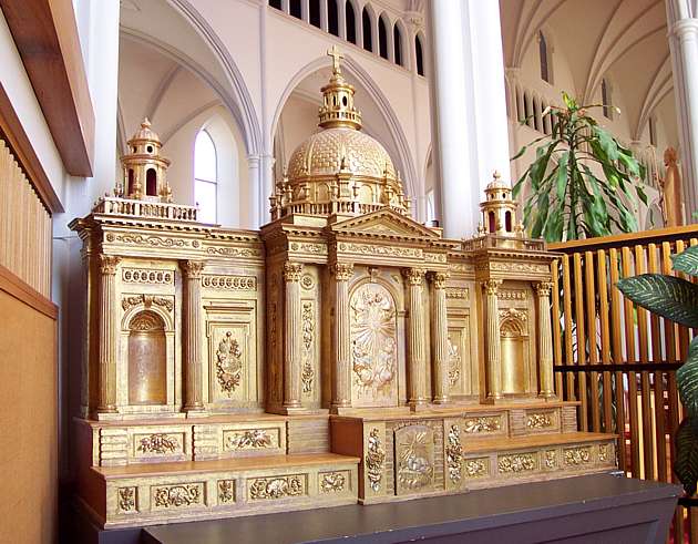 La Cathédrale possède encore, parmi son mobilier, le retable doré du maître-autel de la troisième église, datant de 1833, une oeuvre de François-Thomas Baillargé. On y retrouve aussi la première banquette de la cathédrale actuelle. L'autel majeur, l'autel du Saint-Sacrement, la fontaine baptismale et les ambons sont faits de granit noir du Lac Saint-Jean, des carrières Martineau et Déchambault. L'autel fut consacré par le curé, l'abbé Paul-Émile Brûlé, délégué «ad hoc» par Mgr Louis Levesque, Archevêque, le 20 mai 1968.