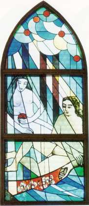 est centre ouest Genèse 1, 27 : "Dieu créa l'homme à son image, à l'image de Dieu il le créa; homme et femme il les créa." De l'ogive où se logent la cime des arbres et les nuages, souffle en forme de rayons bleu d'argent et rose d'or l'Esprit de Dieu. Ces vives couleurs, l'harmonie des lignes et la simplicité des dessins, expriment la beauté originelle du premier couple et laissent une profonde impression de bonheur.