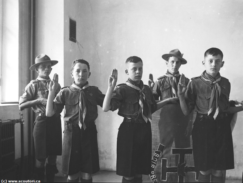 1936-06-14_01 14 juin 1936. Cérémonie de promesse au local du Séminaire de Rimouski. Gérald Lepage, Gabriel Dubé et Albert Jessop. |