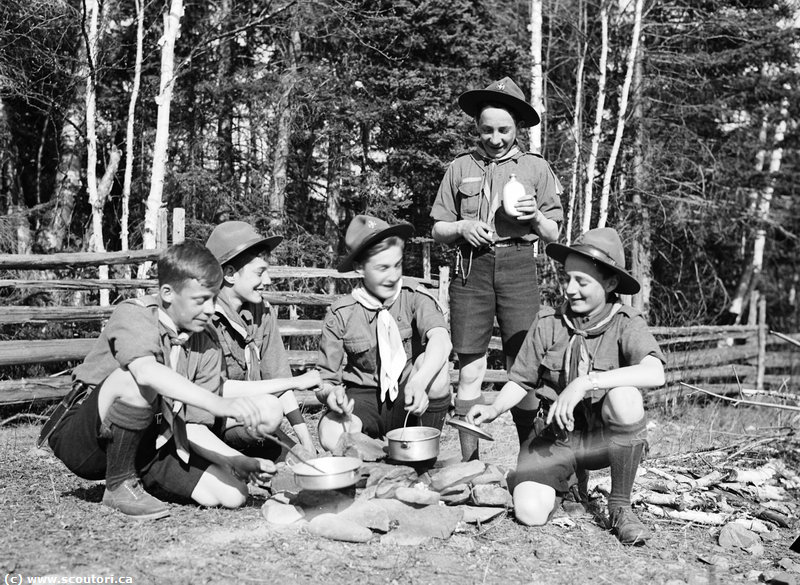 1937-05-04_03 4 mai 1937. Excursion à la passerelle de l'ancienne "Dynamo" de la rivière Rimouski. Le thé avec le jeune scout Robert Landry d'Edmundston (au milieu). |