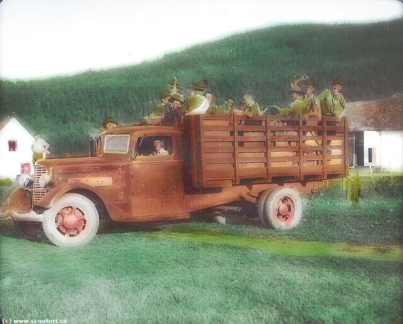 1937-07-19_00c 19 au 28 juillet 1937. Camp scout à la Pointe Mercier, Saint-Fabien-sur-Mer. Départ. Camion d'Elzéar Côté transportant le bagage et quelques scouts. |